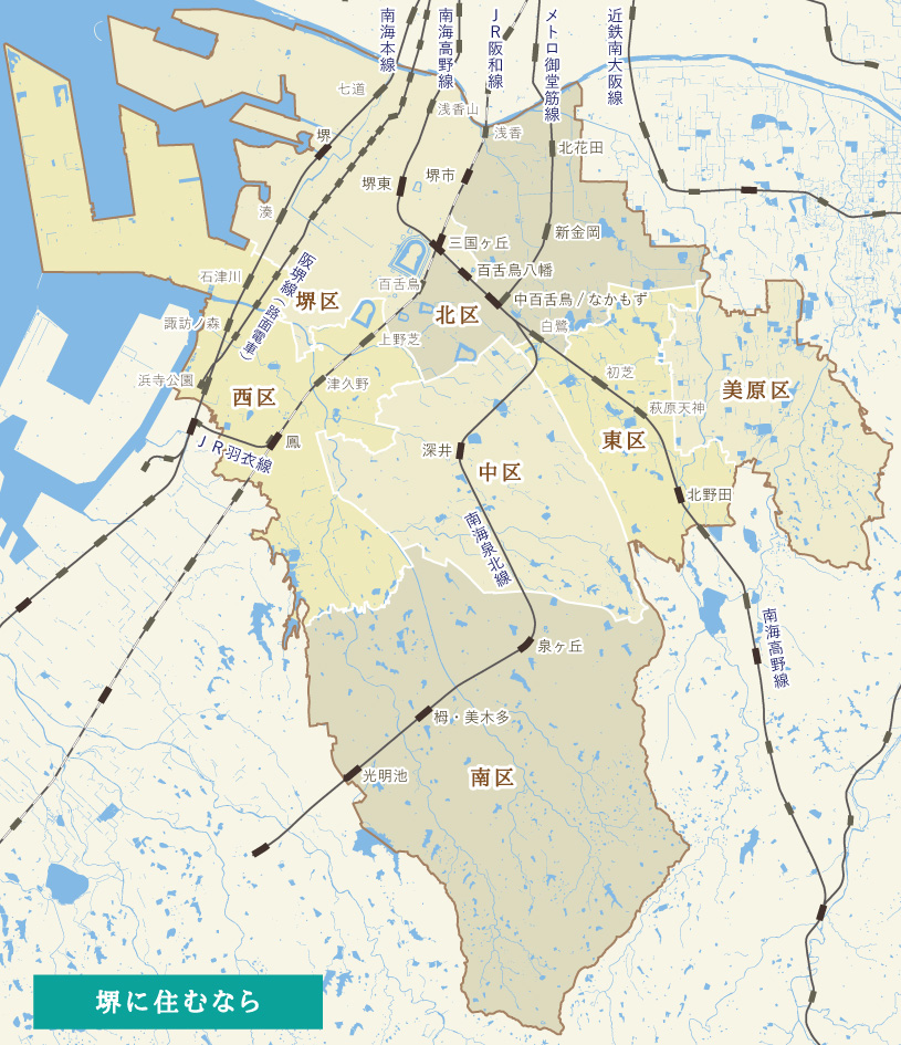鉄道の路線は7路線、46個の駅があり、同じ堺市内でも、場所によって雰囲気・土地柄がぜんぜん違います。